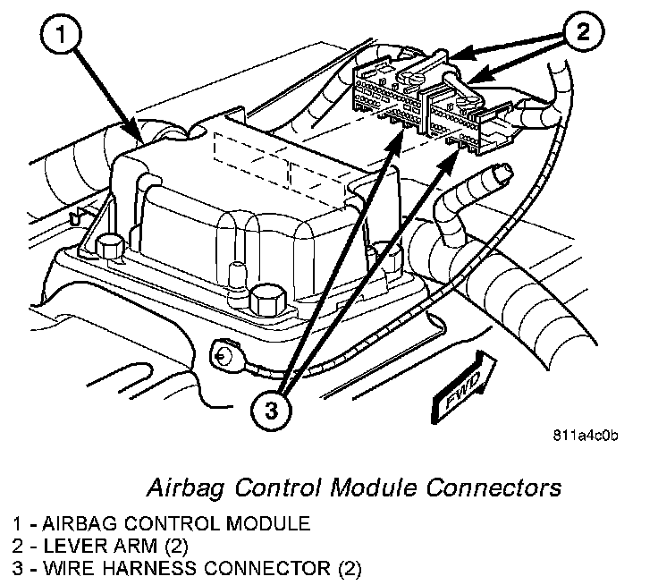 3. Reconnect the two wire harness connectors (one each from the instrument panel and the body wire harnesses) for the ACM to the ACM connector receptacles located on the forward facing side of the module . Be certain that the latches on both connectors are each fully engaged.