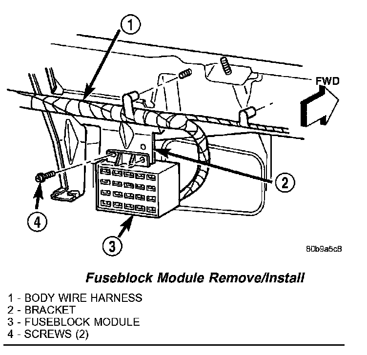 NOTE: If the fuseblock module is being replaced with a new unit, be certain to transfer each of the fuses from the faulty fuseblock module to the proper cavities of the replacement fuseblock module. Refer to Fuse/Fuse Block in the index for the location of complete fuse-block module circuit diagrams and cavity assignments.