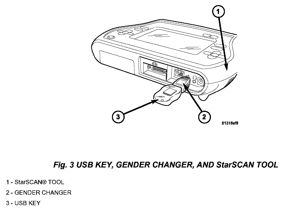 6. With the StarSCAN tool powered OFF, connect the USB Key and Gender Changer to the StarSCAN tool USB port (Fig. 3).