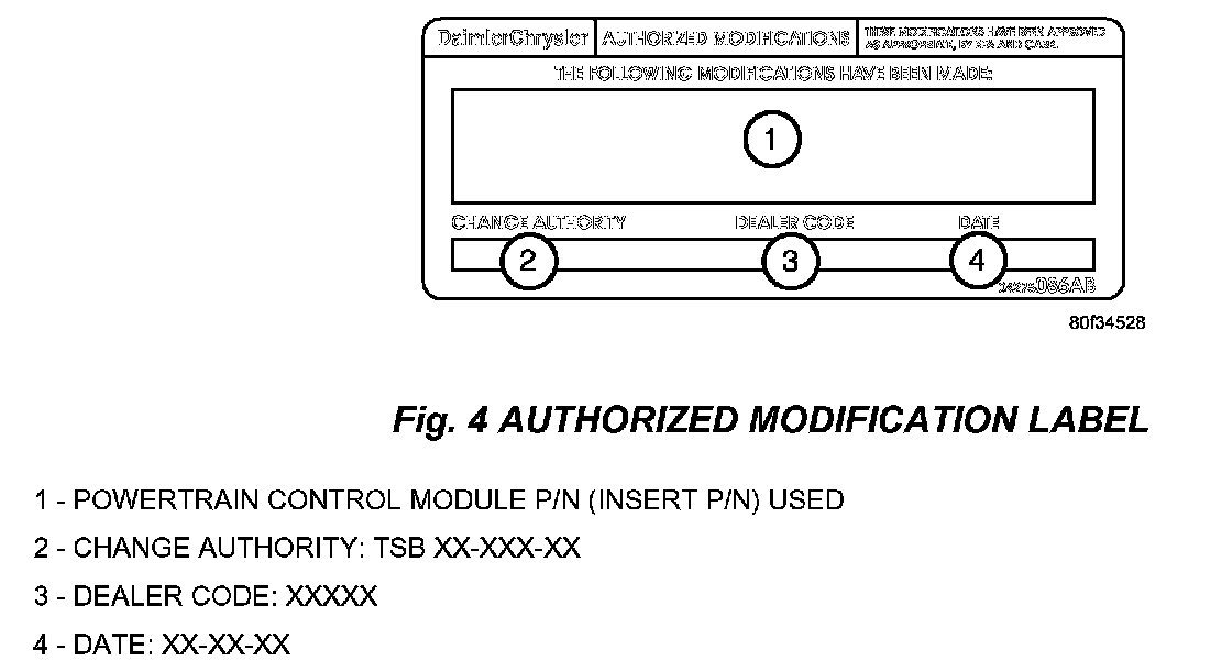 14. Type the necessary information on the "Authorized Modification Label" p/n 04275086AB and attach near the VECI label (Fig. 4).