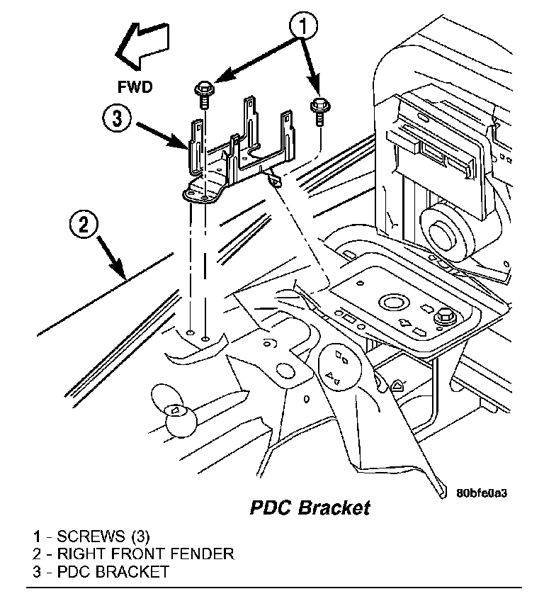 3. Remove the three screws that secure the PDC bracket to the right front inner fender.