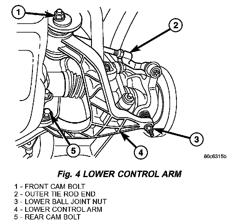 STANDARD PROCEDURE - CAMBER AND CASTER ADJUSTMENTCamber and caster angle adjustments involve changing the position of the lower control arm cam bolts. (Fig. 4)
