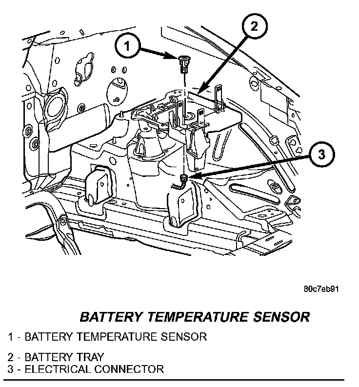 The battery temperature sensor is located under vehicle battery and is attached to a mounting hole on battery tray.
