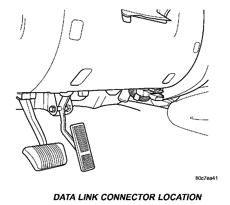 The Data Link Connector (DLC) is a 16-way molded plastic connector insulator on a dedicated take out of the instrument panel wire harness. This connector is located at the lower edge of the instrument panel, inboard of the steering column. The connector insulator is retained by two screws through two integral mounting tabs to the lower instrument panel reinforcement, just below the lower edge of the instrument panel steering column opening cover.