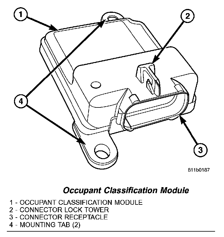 The OCM cannot be adjusted or repaired and, if damaged or faulty, it must be replaced. The components of the passenger side front seat cushion including the cushion frame, springs, insulator pad, seat weight bladder and pressure sensor, seat cushion foam, wire harness and the OCM are serviced only as a factory-calibrated, assembled and tamper-evident unit. Only the OCM and the seat cushion trim are available for separate service replacement. Once a service replacement package has been installed in a vehicle, the OCM can thereafter be serviced only by replacing the entire passenger side front seat cushion unit with another complete service replacement package.
