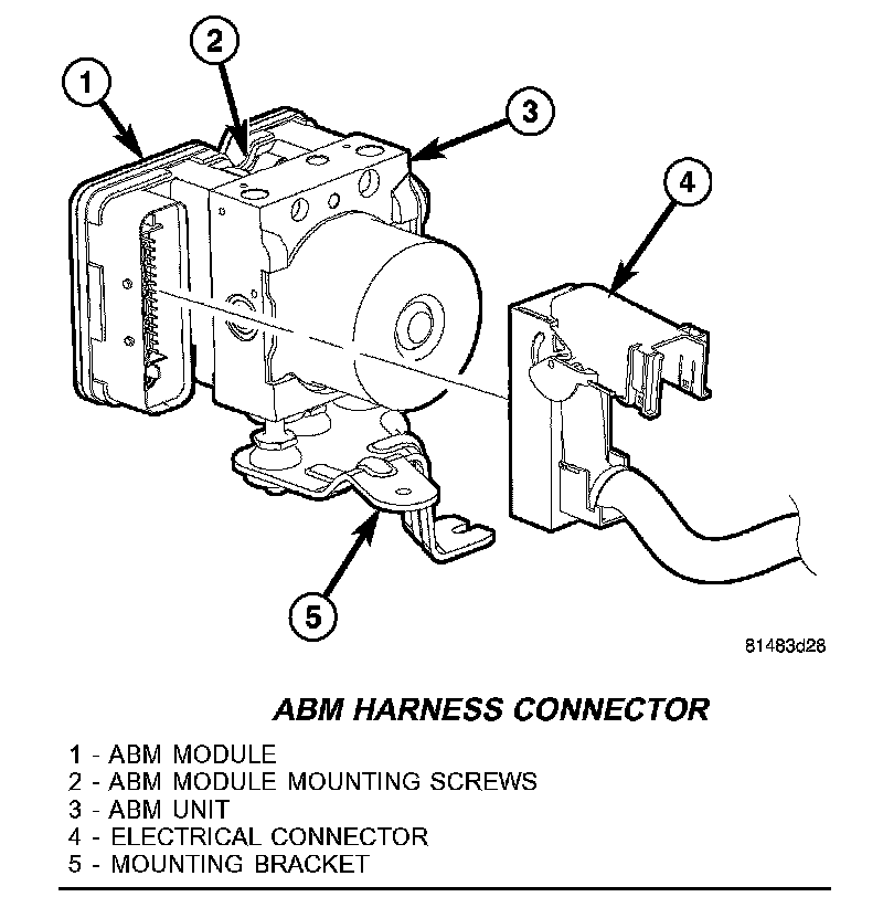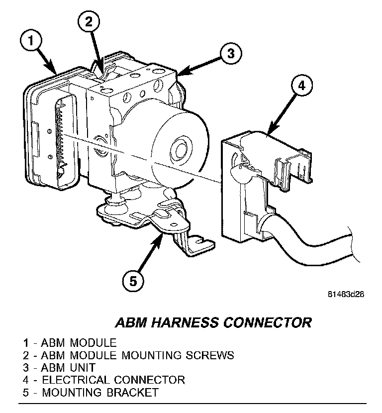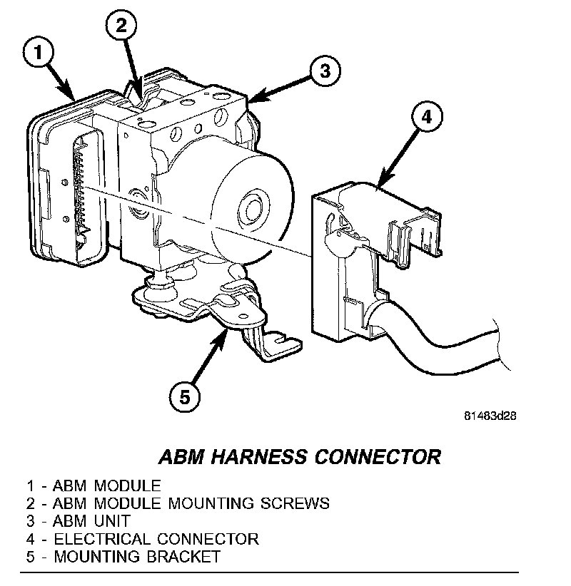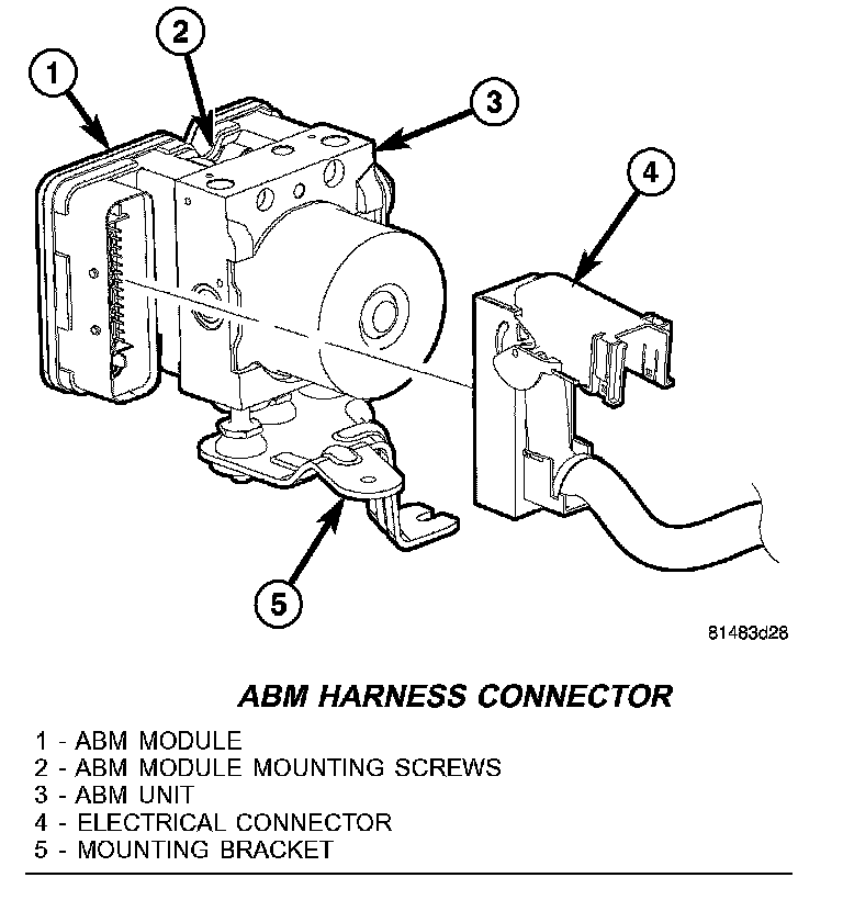 2. Pull up on the ABM harness connector (4) release and remove connector.