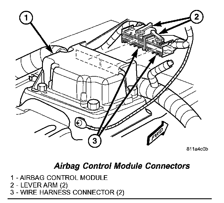 3. Reconnect the two wire harness connectors (one each from the instrument panel and the body wire harnesses) for the ACM to the ACM connector receptacles located on the forward facing side of the module. Be certain that the latches on both connectors are each fully engaged.