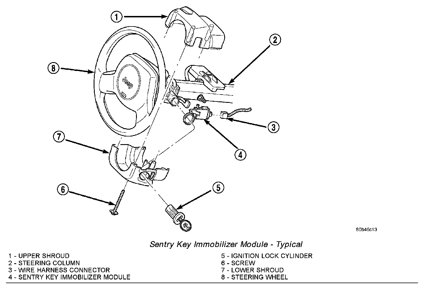 1. Position the Sentry Key Immobilizer Module (SKIM). On models with a manual transmission, lift the multi-function switch upward off of the upper steering column housing far enough to insert the SKIM antenna formation between the ignition key release button and the multi-function switch housing.