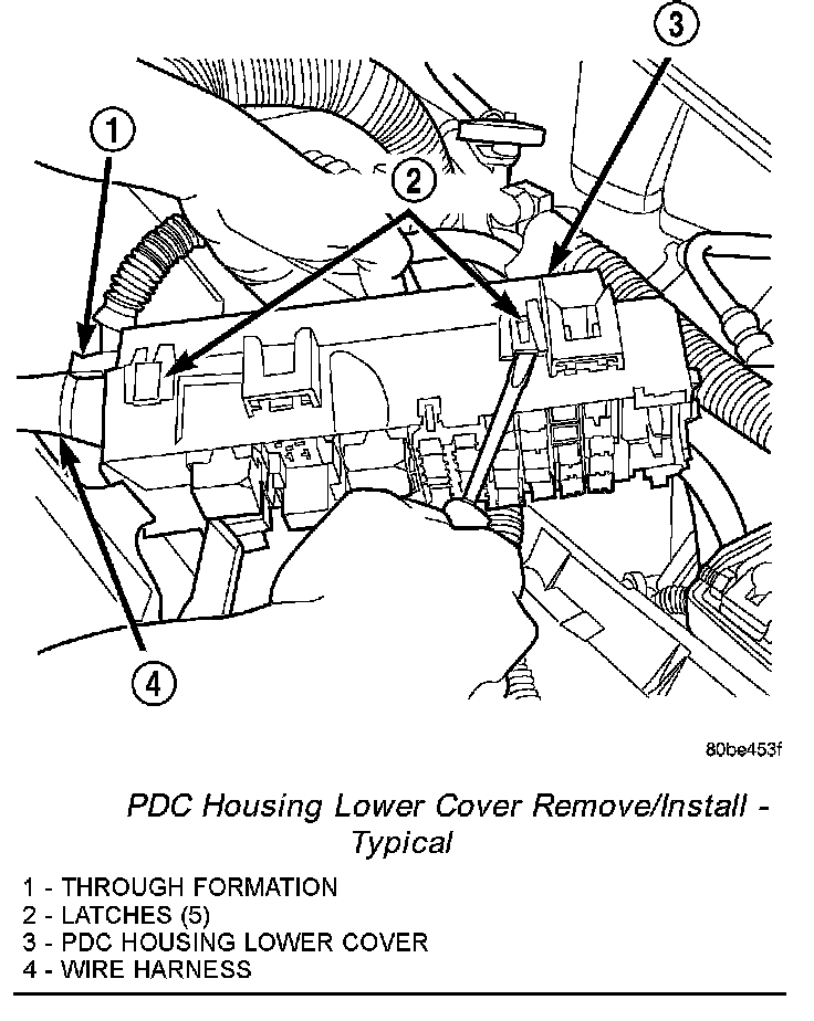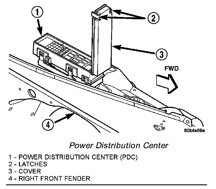 The Power Distribution Center (PDC) cover, the PDC housing lower cover, the PDC relay wedges, the PDC relay cassettes and the PDC B(+) terminal stud module are available for service replacement. The PDC cover can be simply unlatched and removed from the PDC housing without the PDC being removed or disassembled. Service of the remaining PDC components requires that the PDC be removed from its mounting and disassembled. Refer to Wiring Repair in Diagram Information and Instructions or Diagnostic Aids for the location of the proper wiring repair procedures.