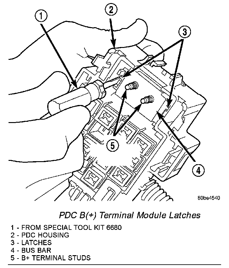 2. From the top of the PDC housing, use a small screwdriver or a terminal pick tool (Special Tool Kit 6680) to release the two latches that secure the B(+) terminal module in the PDC.