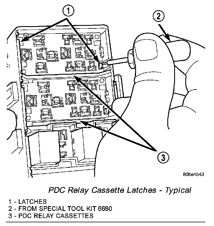 2. From the top of the PDC housing, use a small screwdriver or a terminal pick tool (Special Tool Kit 6680) to release the two latches that secure the relay cassette in the PDC.