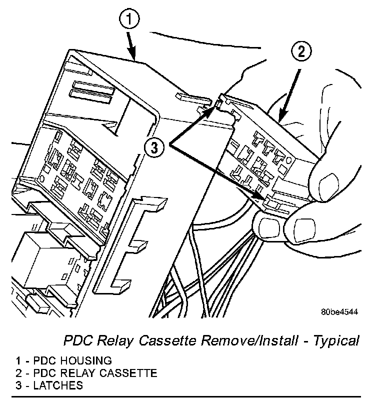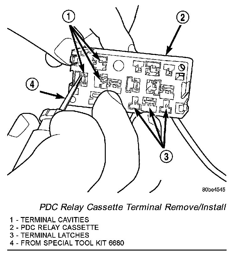 CAUTION: Proper care must be taken to be certain that the wiring and terminals from the faulty PDC relay cassette are installed in the correct terminal cavities of the replacement relay cassette. To prevent mistakes it is recommended that the wiring and terminals be removed from the faulty relay cassette one cavity at a time, repaired or spliced as necessary, then installed securely into the correct cavity of the replacement relay cassette. If you are not absolutely certain into which cavity a terminal should be installed, refer to Power and Ground Distribution Wiring Diagram Index for the location of complete PDC wiring diagrams.