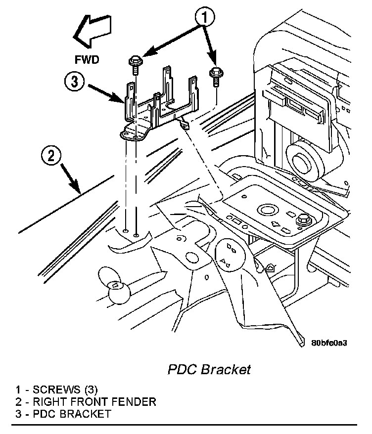 3. Remove the three screws that secure the PDC bracket to the right front inner fender.