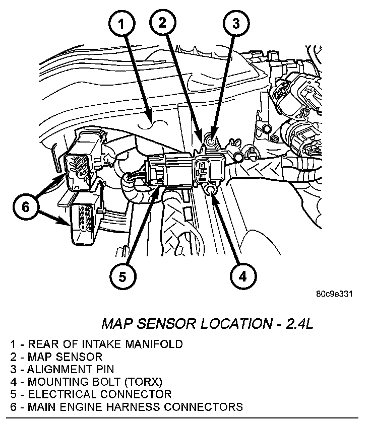The Manifold Absolute Pressure (MAP) sensor is mounted into the rear of the intake manifold. An O-ring is used to seal the sensor to the intake manifold.