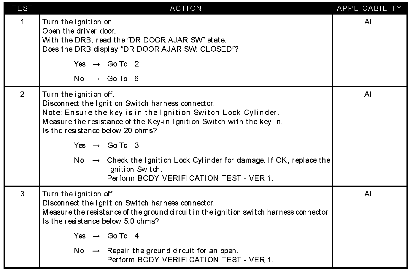 CHIME INOPERATIVE WITH KEY IN IGNITION, DRIVER'S DOOR OPEN