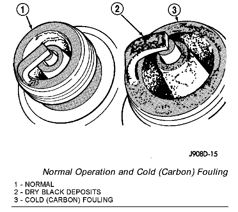 Cold fouling is sometimes referred to as carbon fouling. The deposits that cause cold fouling are basically carbon. A dry, black deposit on one or two plugs in a set may be caused by sticking valves or defective spark plug cables. Cold (carbon) fouling of the entire set of spark plugs may be caused by a clogged air cleaner element or repeated short operating times (short trips).