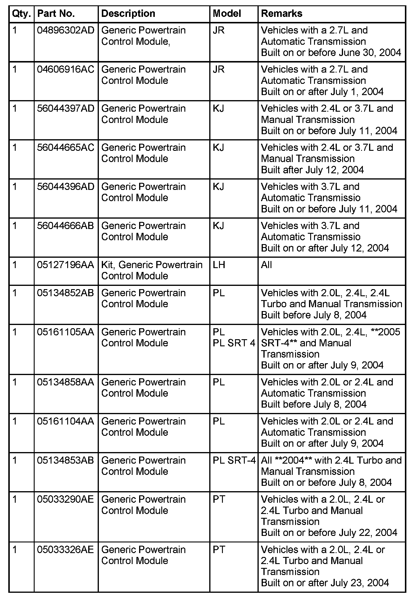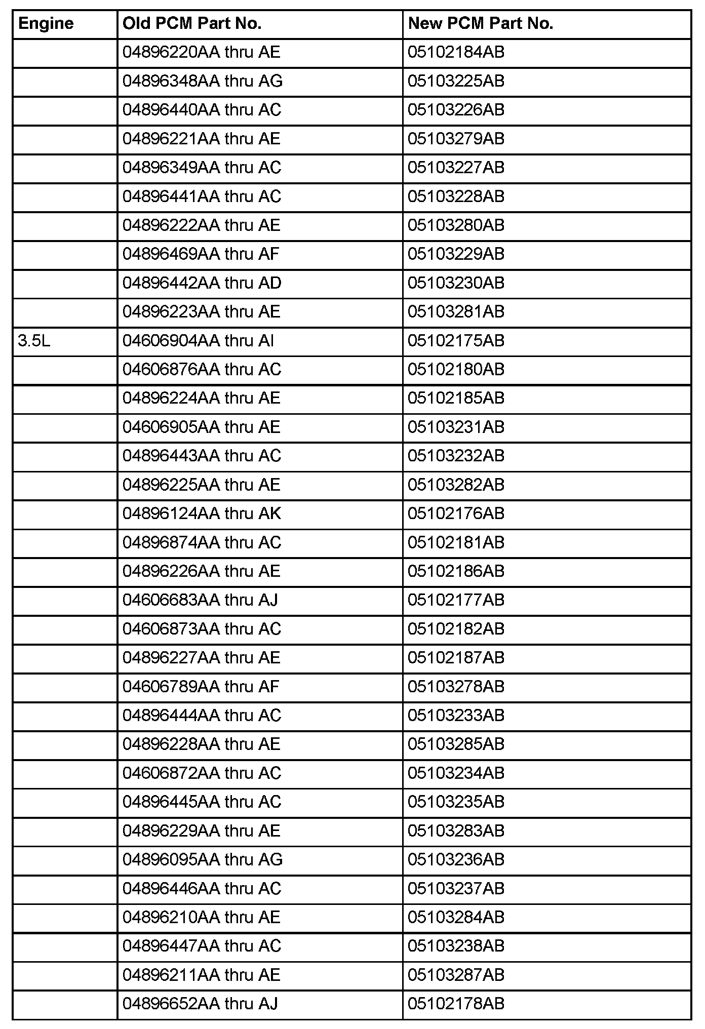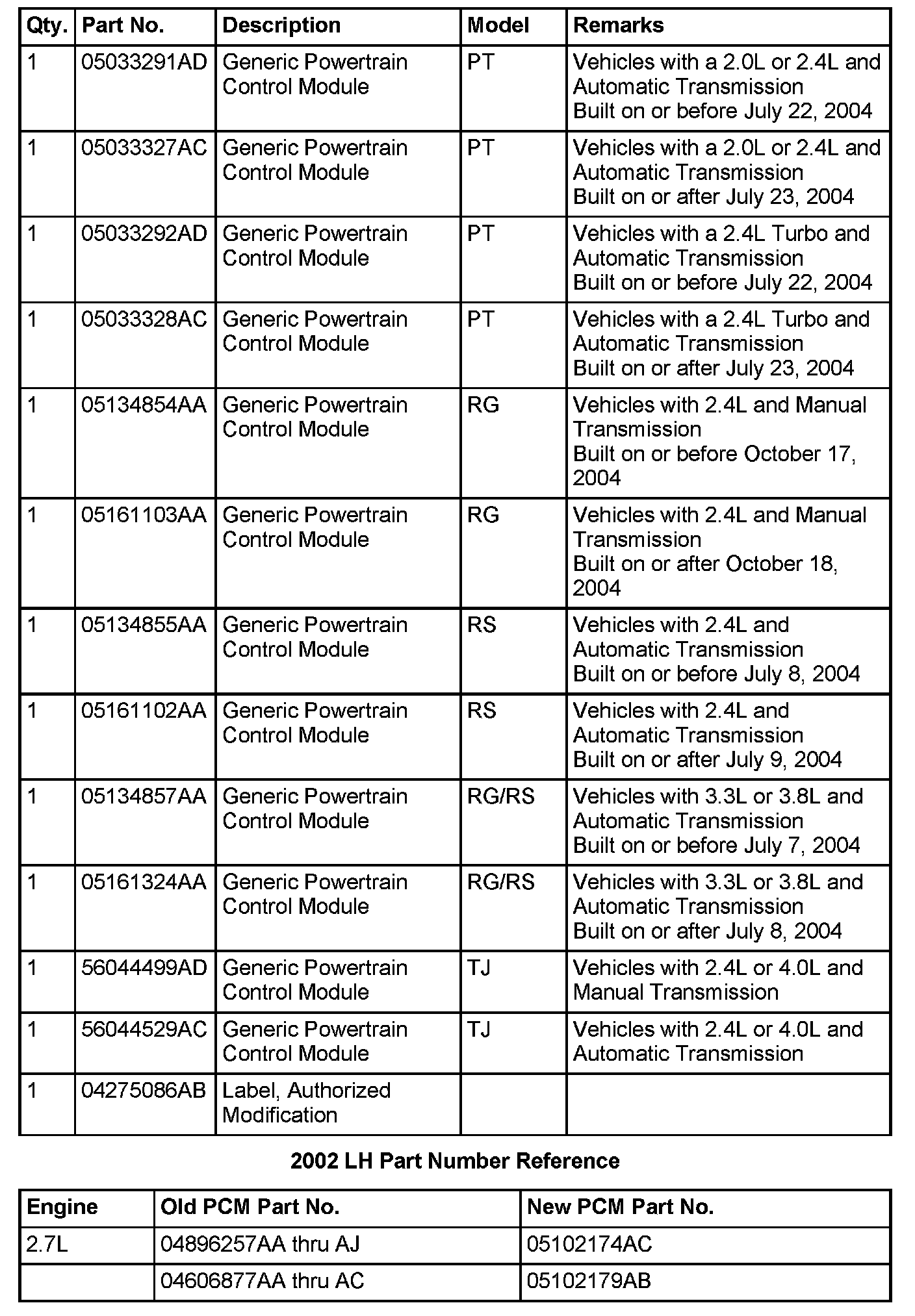 If your vehicle is a 2002 LH and the original PCM part number begins with 04 the technician should use the 2002 LH Part Number Reference chart above to determine the corresponding "NEW" part number. This new number from the chart should then be entered into the Tech tools application as the original part number. If the original PCM number begins with 05 no change to the flash selection process is required.