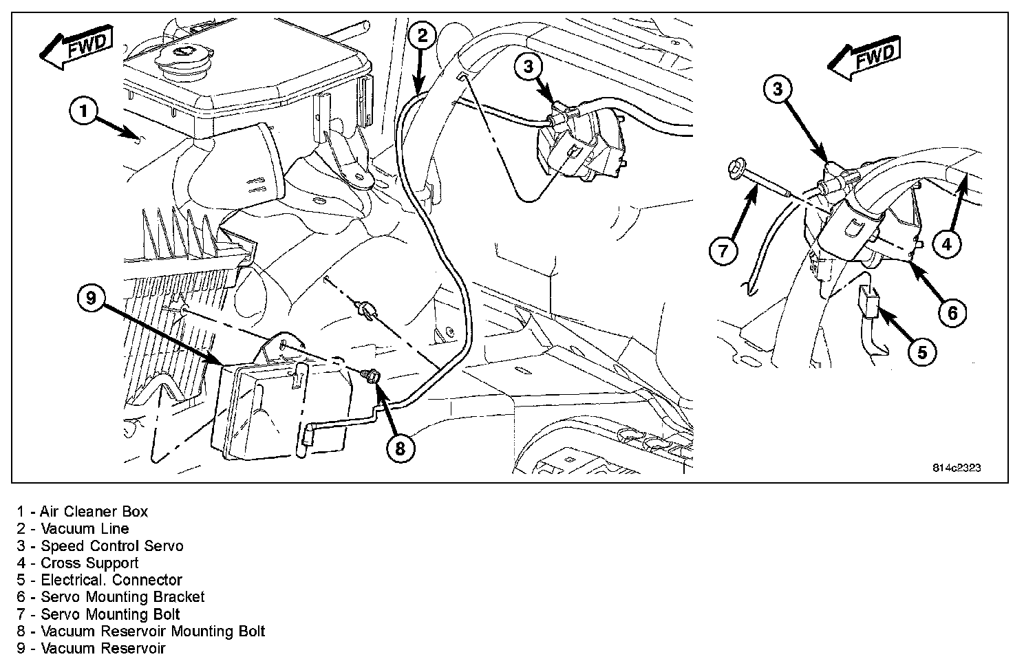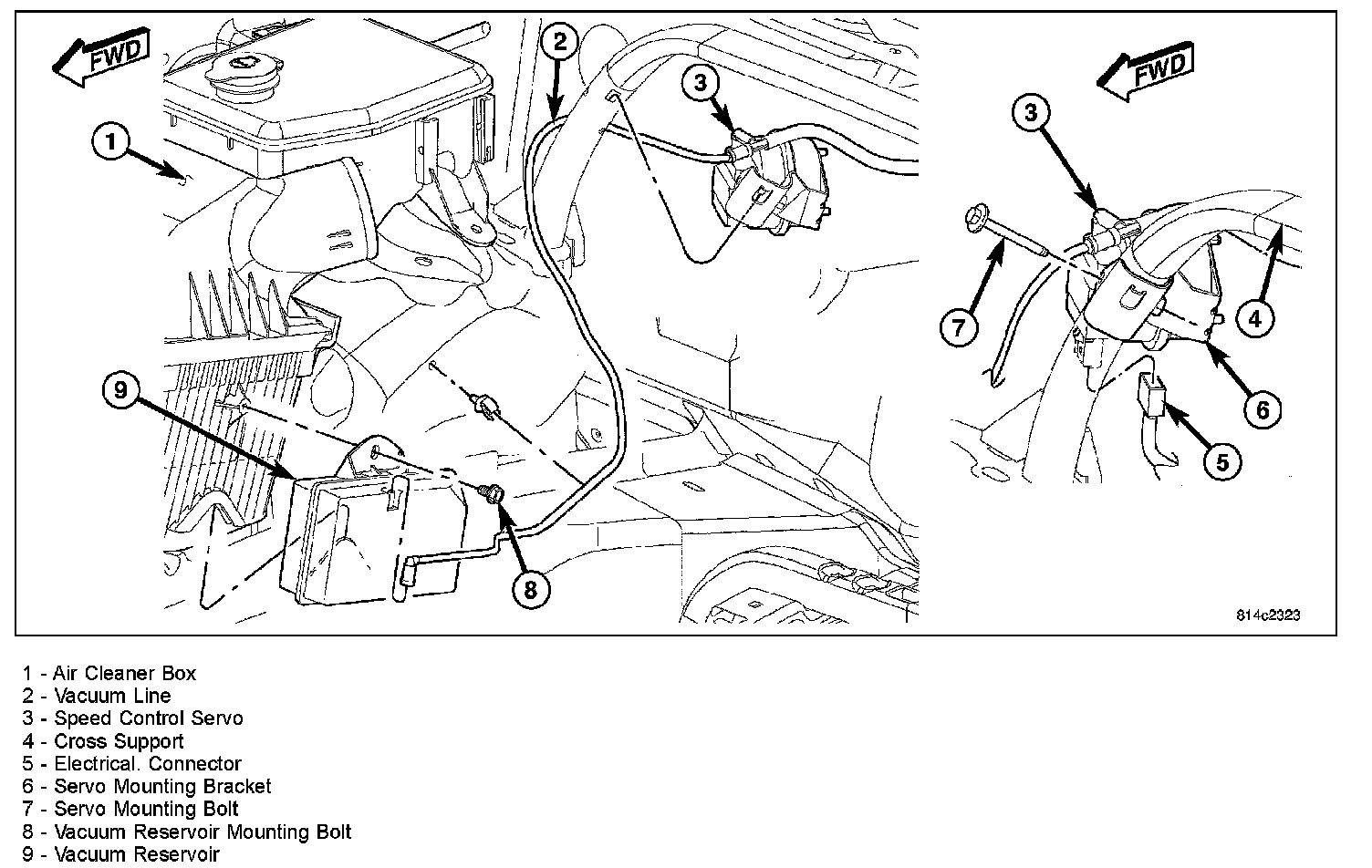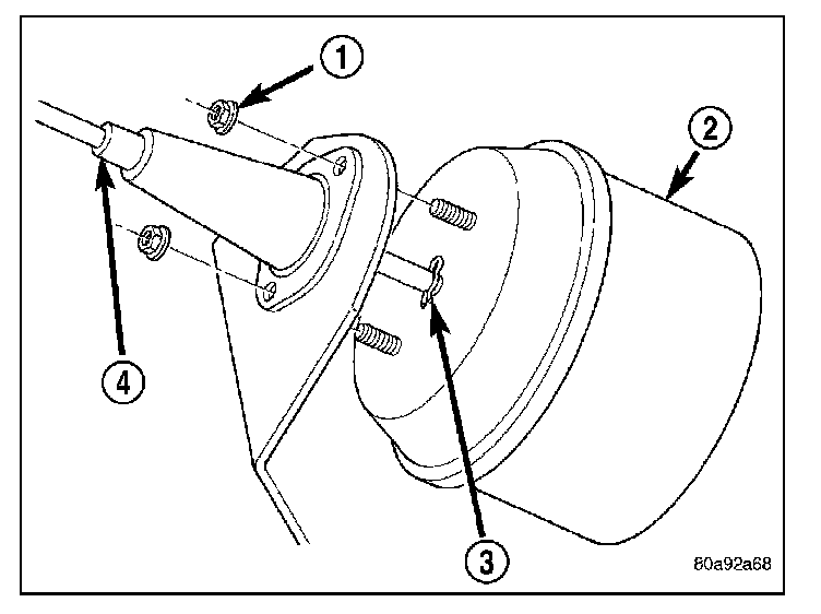 The speed control servo assembly (3) is attached to a cross-support (4) located in the engine compartment.