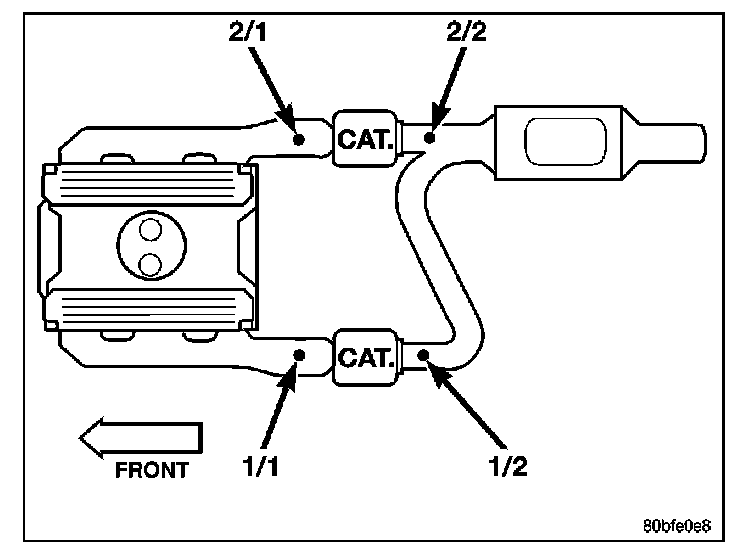REMOVALRefer to graphic for typical O2S (oxygen sensor) locations if equipped with four oxygen sensors.