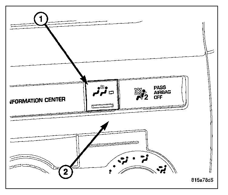 Primary on/off control for the rear blower motor is provided by a switch (1) located in the accessory switch bezel (2) above the front A/C-heater control.