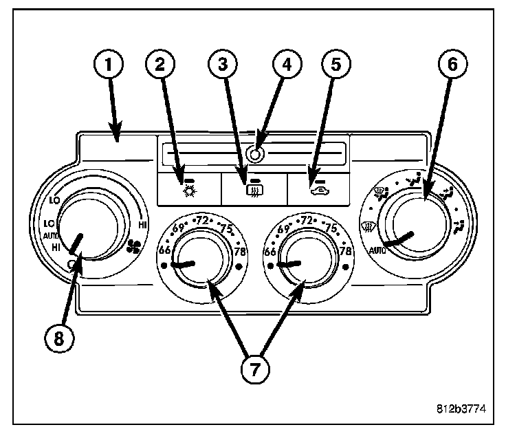 The A/C-heater control (1) for the automatic temperature control (ATC) dual zone heating-A/C system allows both the driver and the front seat passenger the ability to individually regulate air temperature for their side of the vehicle. All controls are identified by ISO graphic symbols.