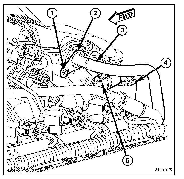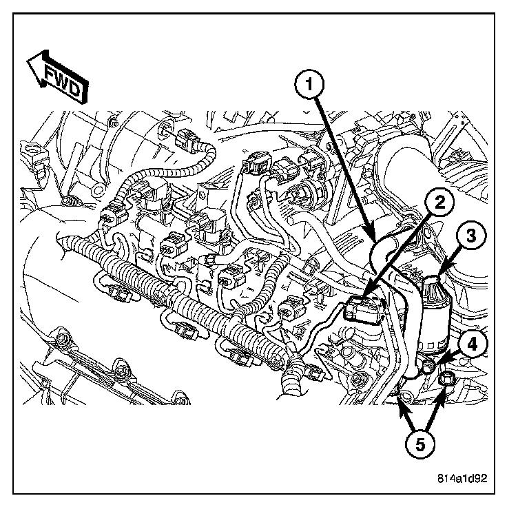 1. Remove electrical connector (5) at top of EGR valve solenoid.