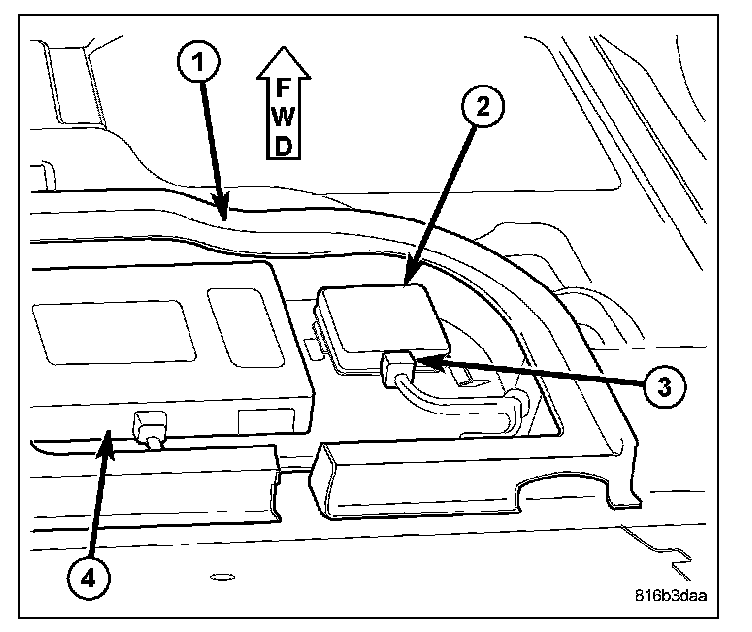 4. Disconnect the body wire harness connector (3) from the intrusion module (2) connector receptacle.