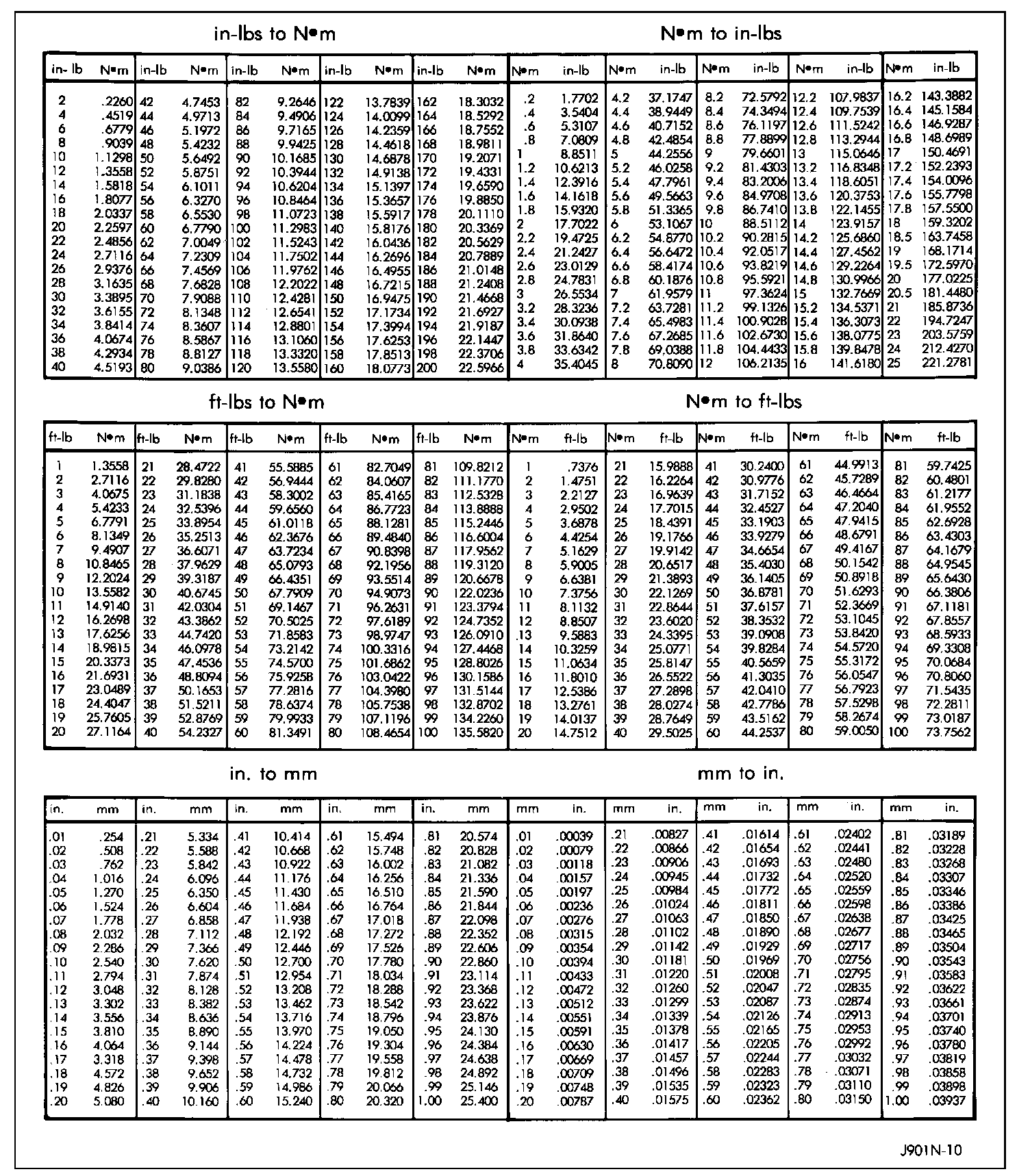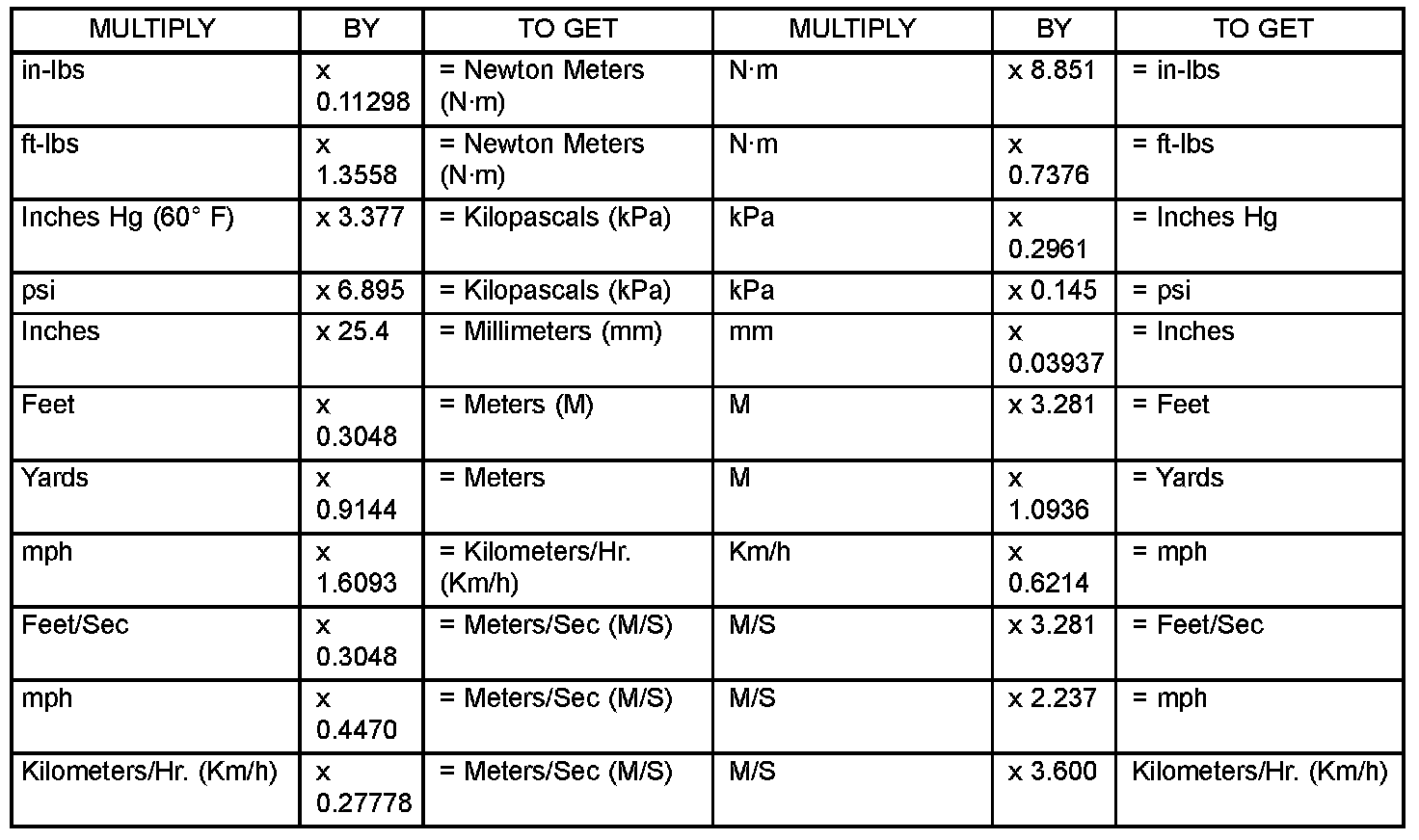 Refer to the Metric Conversion Chart to convert torque values listed in metric Newton-meters (N.m). Also, use the chart to convert between millimeters (mm) and inches (in.).