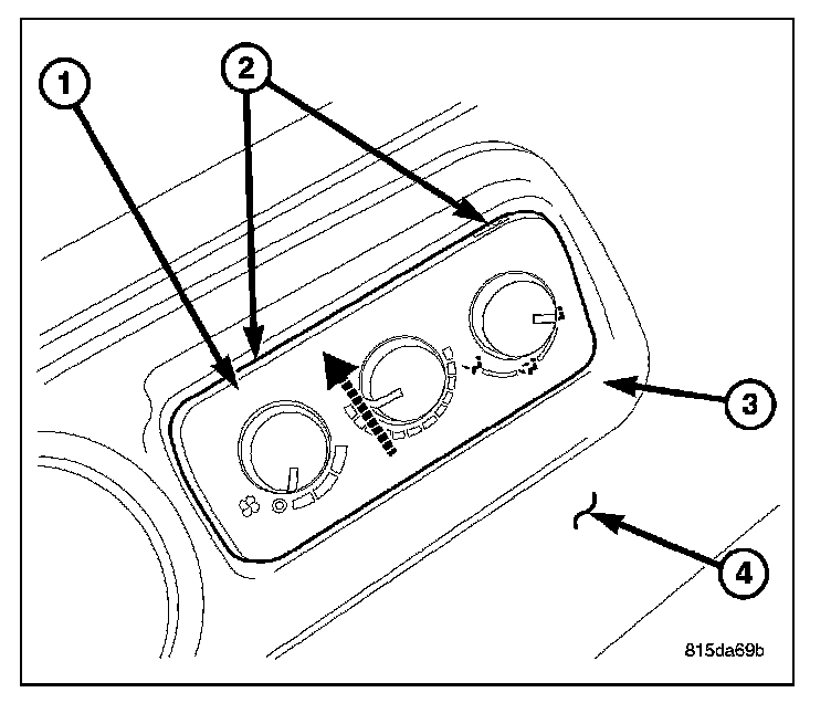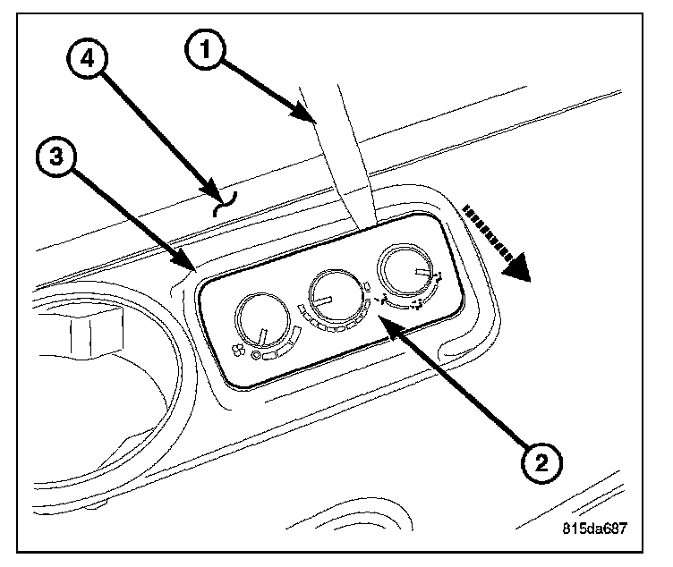 1. Position the rear A/C-heater control (1) near the bezel (3) located in the right interior quarter trim panel (4).