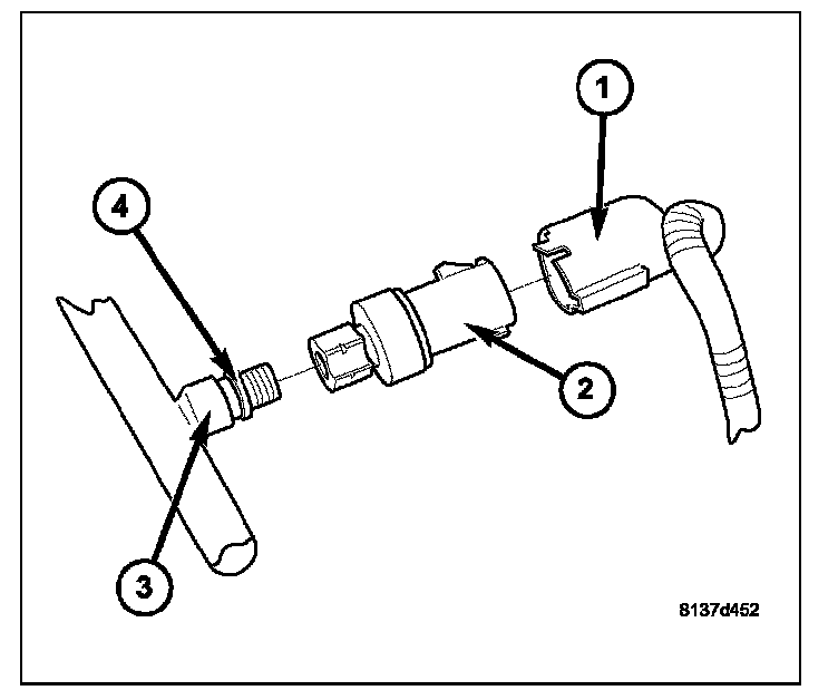 3. Remove the A/C pressure transducer from the fitting on the A/C discharge line and remove and discard the O-ring seal.