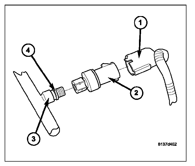 2. Install the A/C pressure transducer (2) onto the A/C discharge line. Tighten the A/C pressure transducer securely.
