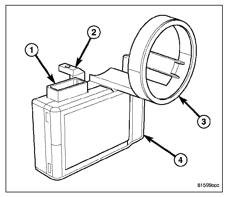 The Sentry Key REmote Entry Module (SKREEM) (4) is sometimes referred to as the Wireless Control Module (WCM). The SKREEM is the primary component of the Sentry Key Immobilizer System (SKIS). It is also the receiver for the Remote Keyless Entry (RKE) system and the Tire Pressure Monitor (TPM) system. The SKREEM is located in the instrument panel, just to the right of the steering column near the ignition lock cylinder housing and is concealed beneath the instrument panel trim. The molded black plastic housing for the SKREEM has an integral molded plastic halo-like antenna ring (3) that extends from one side. When the SKREEM is properly installed, the antenna ring is oriented around the circumference of the ignition lock cylinder housing.
