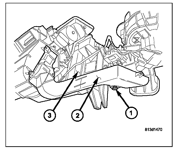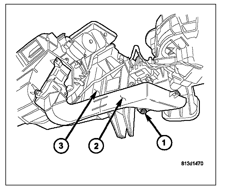 5. Remove the five screws (1) that secure the heater core and tube cover (2) to the HVAC housing (3).
