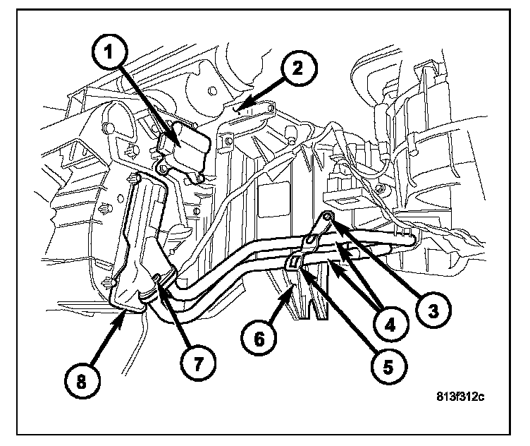 9. Remove the bolt (7) that secures the heater tubes to the heater core (8).