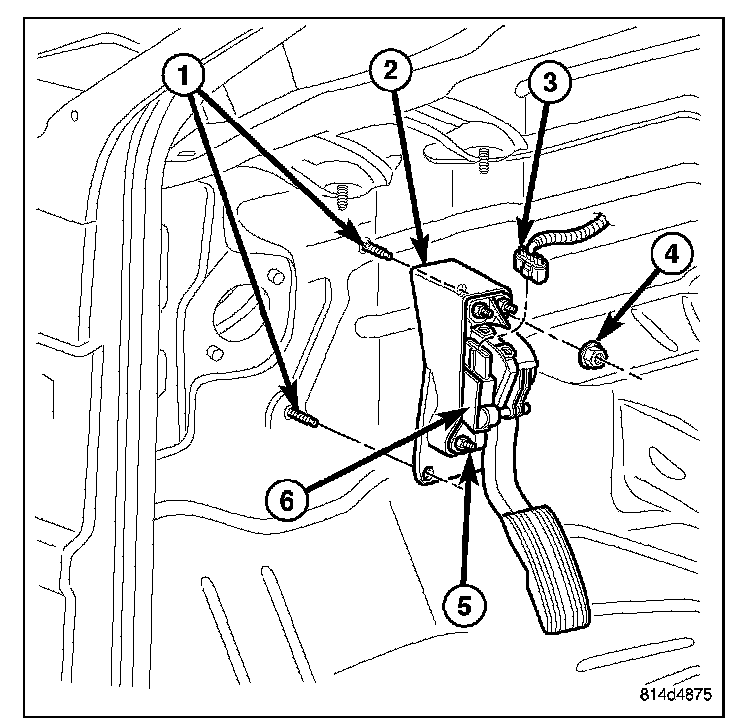 The following procedure applies only to vehicles without the Adjustable Pedal Package (code XAP). It also applies to vehicles equipped with an accelerator pedal position sensor (6).