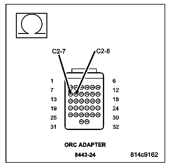 Measure the resistance between the (R64) Passenger Squib 2 Line 1 circuit and the (R62) Passenger Squib 2 Line 2 circuit at the ORC adaptor.