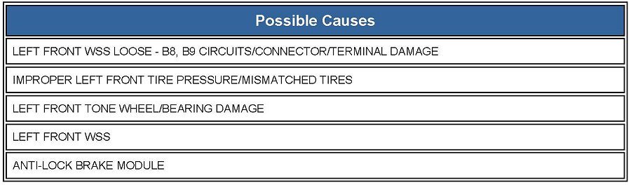 When the Left Front Wheel Speed Sensor (WSS) Signal reading is different from the readings received from the other WSS's at a vehicle speed above 40 km/h (25 mph). The Anti-Lock Brake Module compares WSS readings from side-to-side on an axle and front-to-rear.