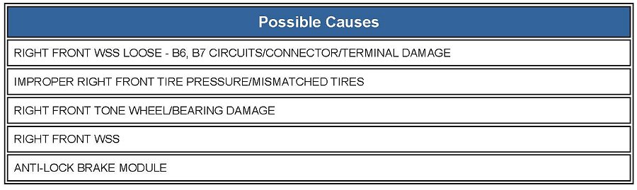 When the Right Front Wheel Speed Sensor (WSS) reading is different from the readings received from the other sensors at a vehicle speed above 40 km/h (25 mph). The Anti-Lock Brake Module compares WSS readings from side-to-side on an axle and front-to-rear.