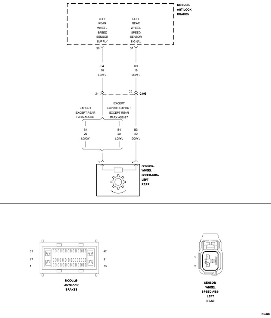 Inspect the (B3) Left Rear WSS Signal and (B4) Left Rear WSS Supply circuits between the Left Rear WSS and Anti-Lock Brake Module for damage.