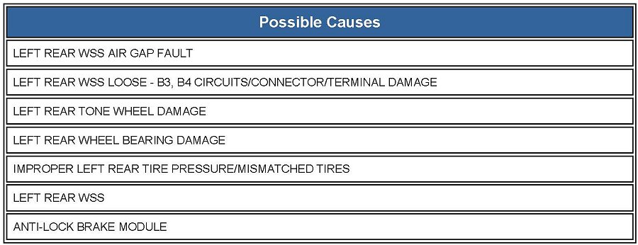When the Left Rear WSS Signal is intermittently missing a vehicle speed above 25 mph (40 kph) or erratic wheel speed signal during acceleration or sensed wheel speed is different from other wheels.