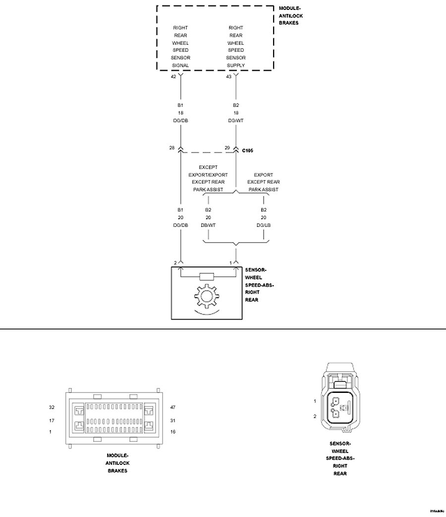 Inspect the (B1) Right Rear WSS Signal and (B2) Right Rear WSS Supply circuits between the Right Rear WSS and Anti-Lock Brake Module for damage.
