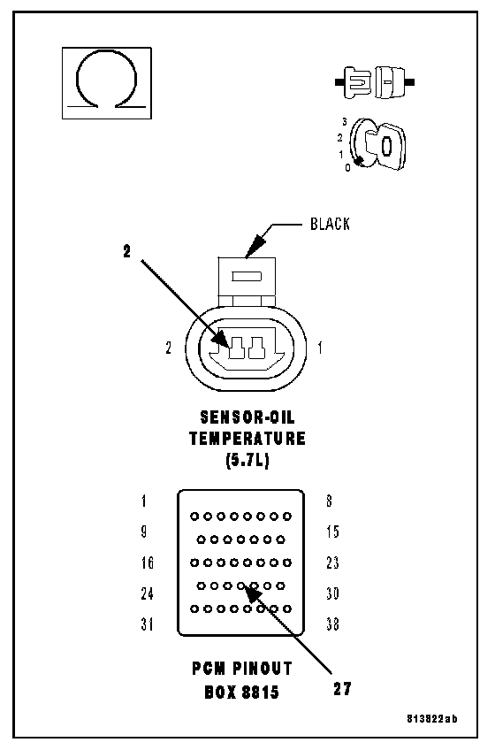 Measure the resistance of the (K900) Sensor ground circuit from the Engine Oil Temp Sensor harness connector to the appropriate terminal of special tool #8815.
