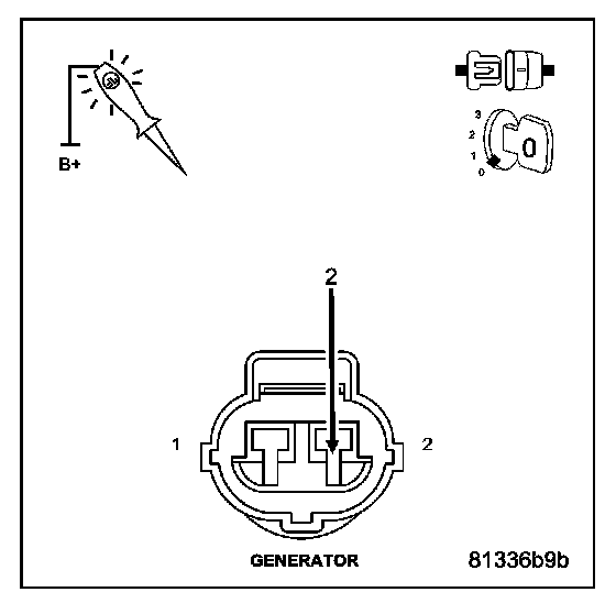 Using a 12-volt test light connected to 12-volts, probe the (Z385) Ground circuit in the Generator Field harness connector.