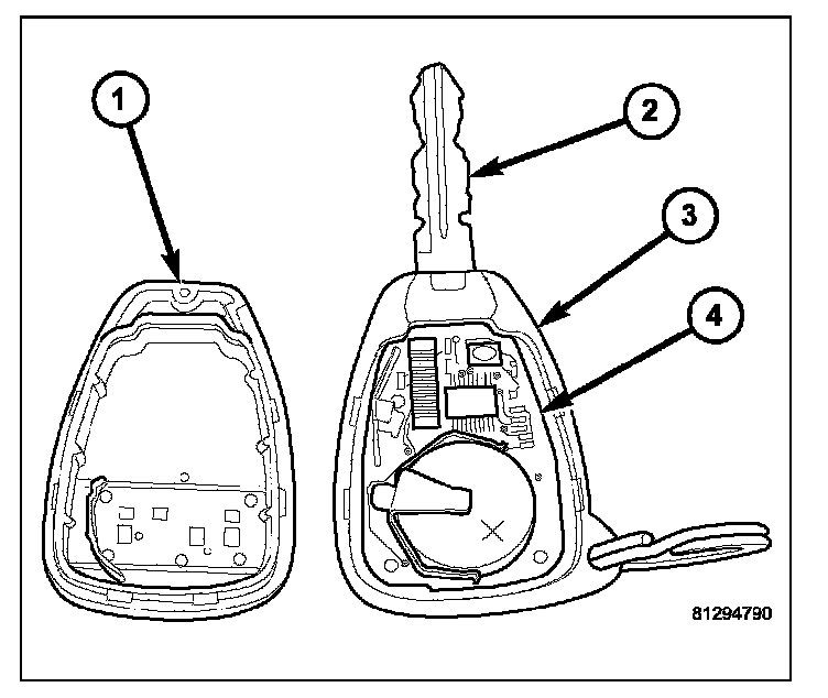 Each ignition key (2) used in the Sentry Key Immobilizer System (SKIS) has a transponder chip included on the circuit board (4) beneath the cover (1) of the integral Remote Keyless Entry (RKE) transmitter (3). In addition to having to be cut to match the mechanical coding of the ignition lock cylinder and programmed for operation of the RKE system, each new Sentry Key has a unique transponder identification code that is permanently programmed into it by the manufacturer, and which must be programmed into the Sentry Key REmote Entry Module (SKREEM) to be recognized by the SKIS as a valid key. The Sentry Key transponder cannot be adjusted or repaired. If faulty or damaged, the entire key and RKE transmitter unit must be replaced.