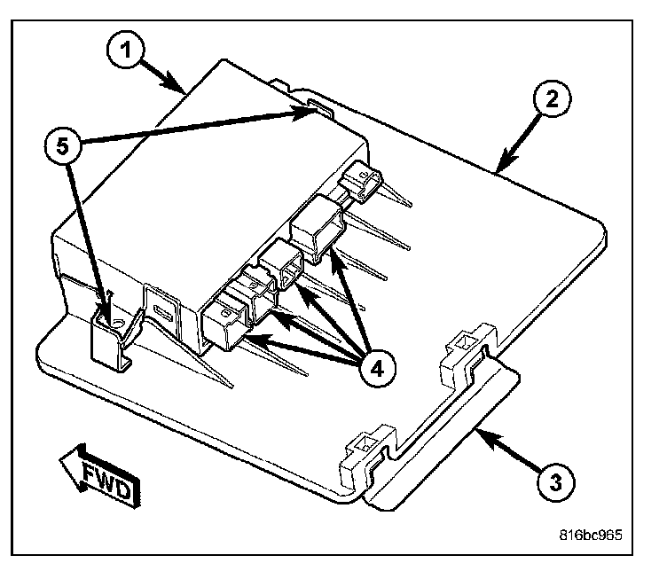 1. Position the Trailer Tow Module (TTM) (1) to the mounting plate (2) and insert the two mounting tabs on the sides of the module into the latch feature (5) cavities in the plate.