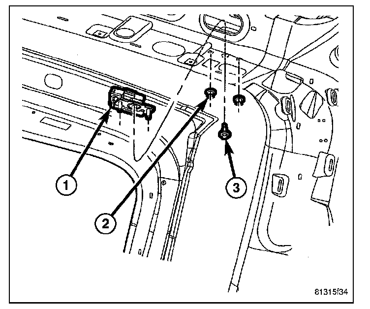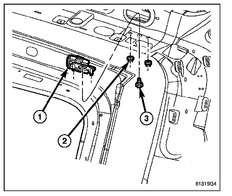 7. Carefully pull the rear edge of the headliner downward from the header far enough to access and remove the two nuts (2) and one bolt (3) that secure the hinge studs to the underside of the header.