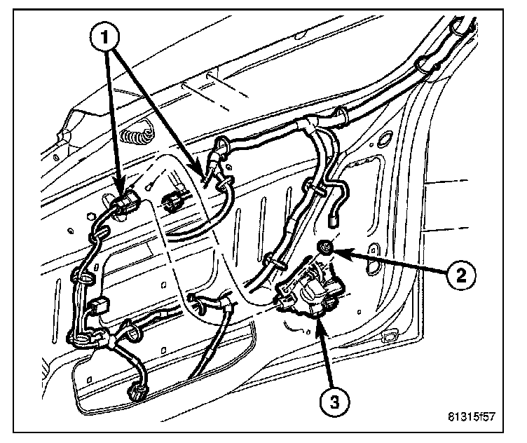 5. Remove the two nuts (2) that secure the latch (3) to the inside of the liftgate.