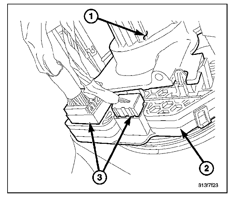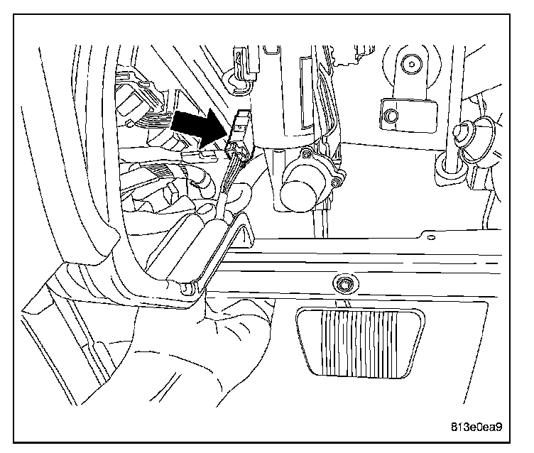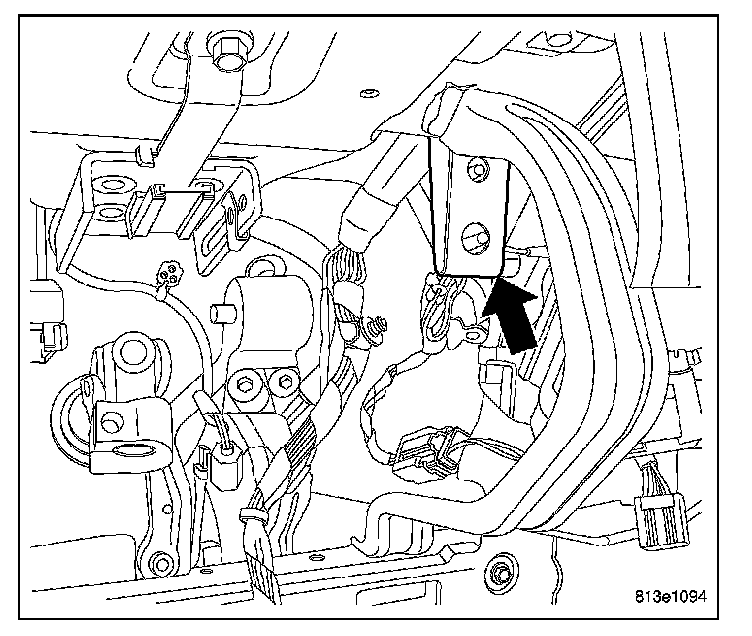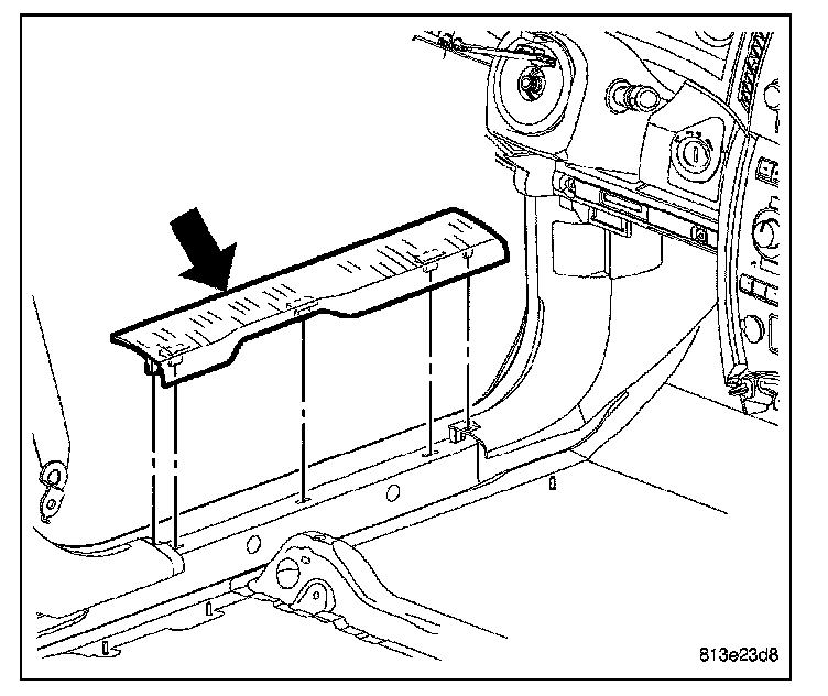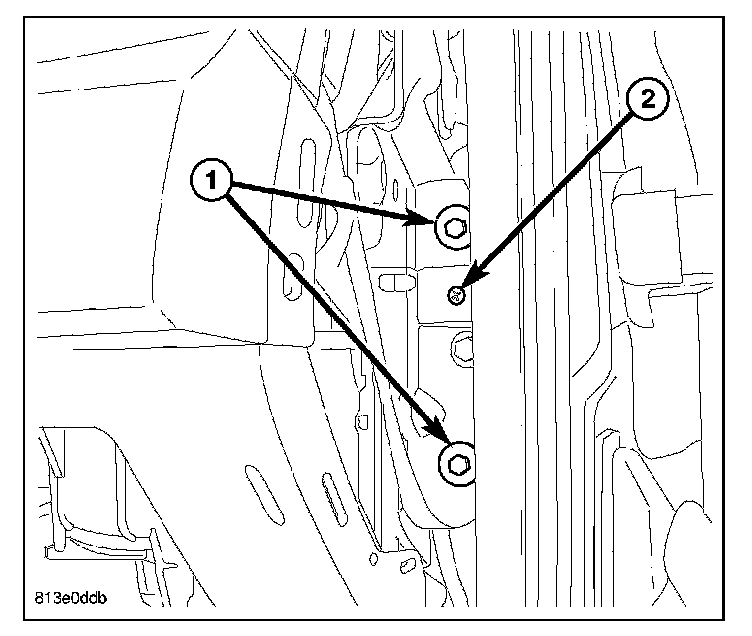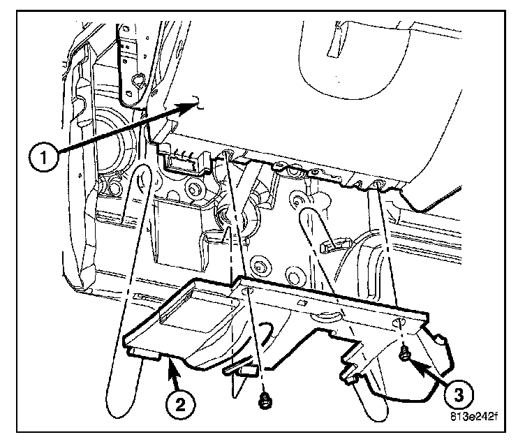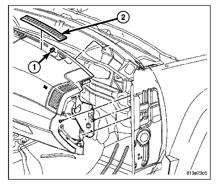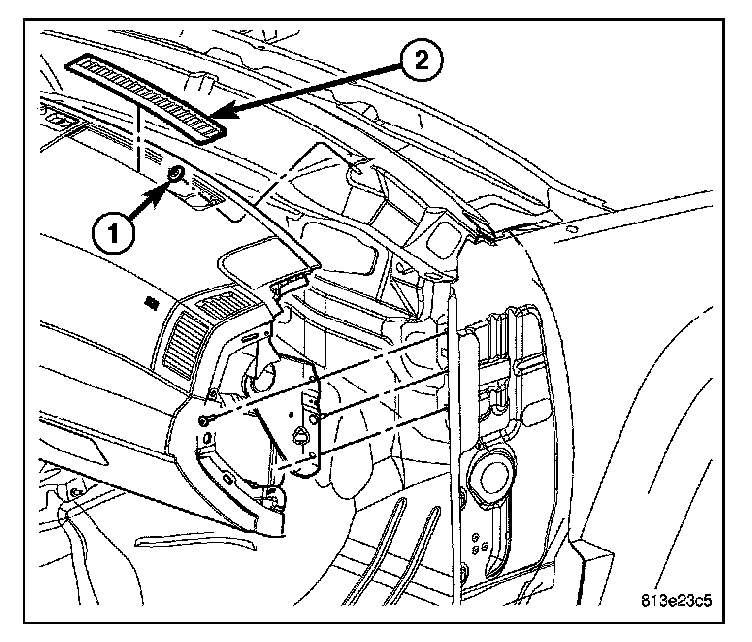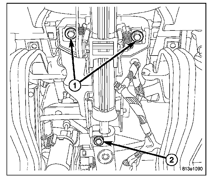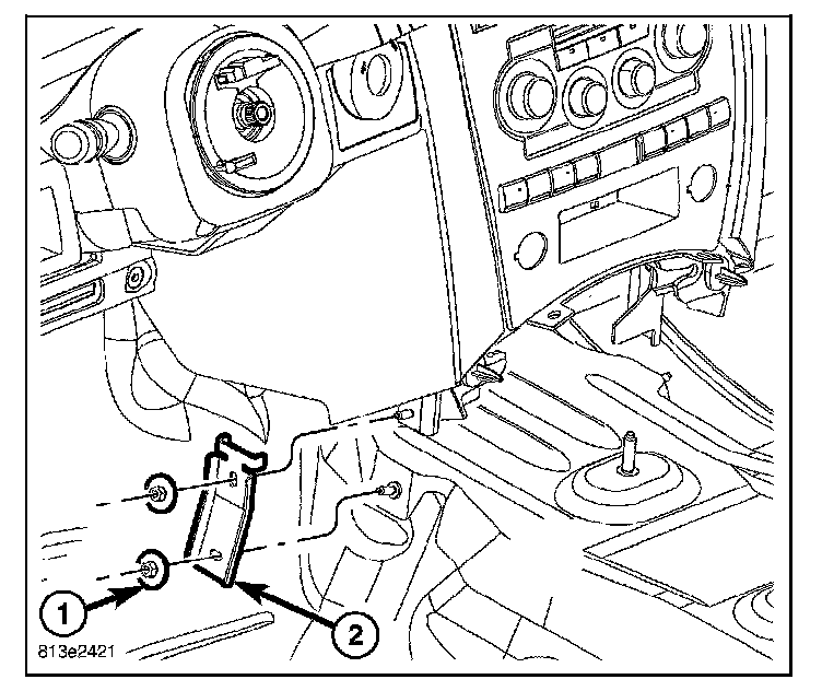 5. Guide the peddle support studs (2) on the drivers side, into the slots in the instrument panel reinforcement.
