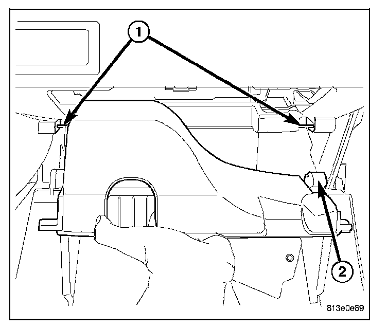 12. Snap the lower glove box hinges (2) over the pivots (1) and rotate up.