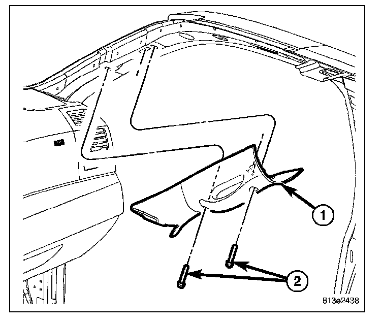 44. Install the left a-pillar trim, the bolts and position the door seal back.* Right a-pillar trim shown, left similar.